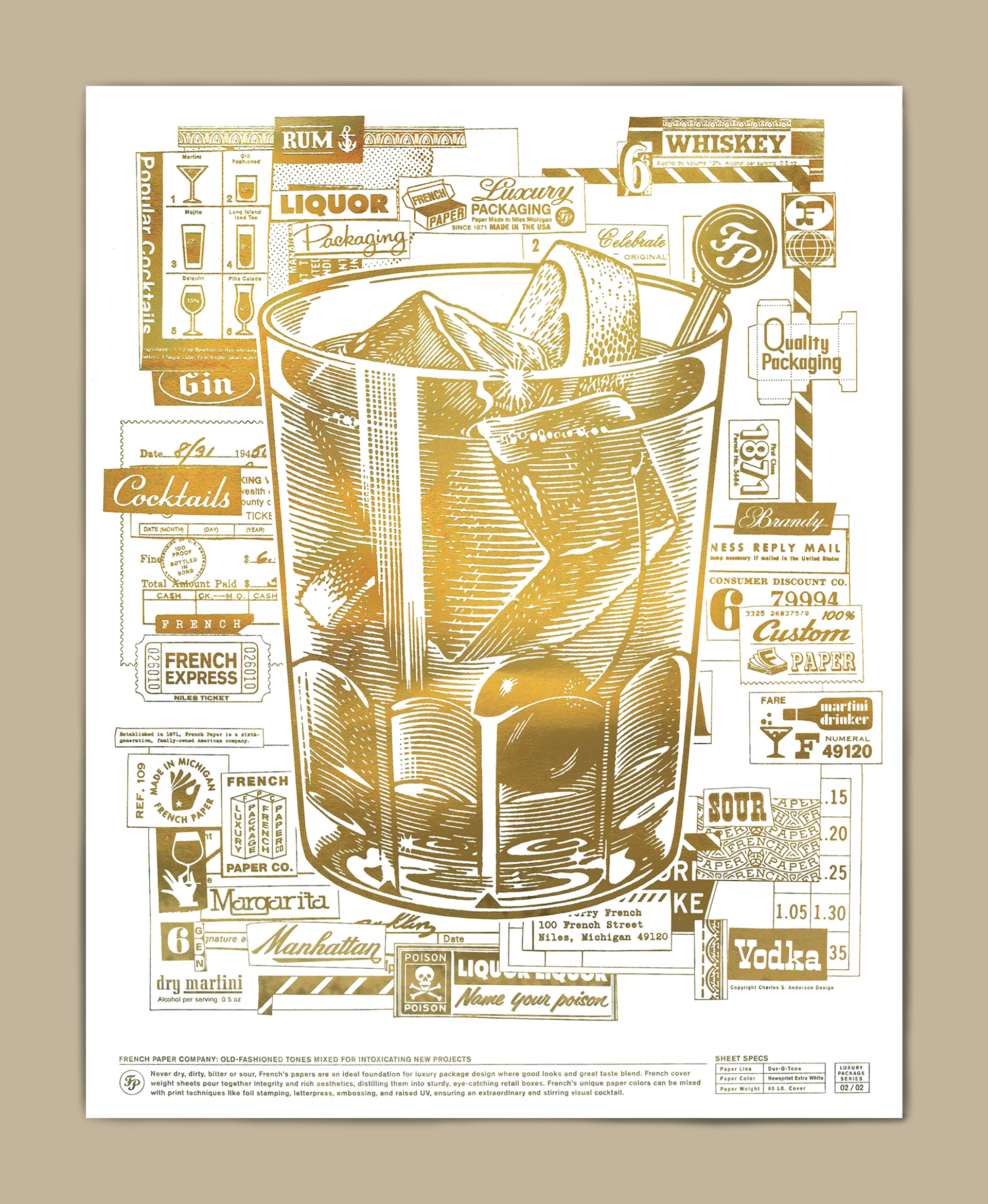 A 2 poster series promoting specialty paper in the liquor and wine categories. Printed in Gold foil on uncoated white paper stock.