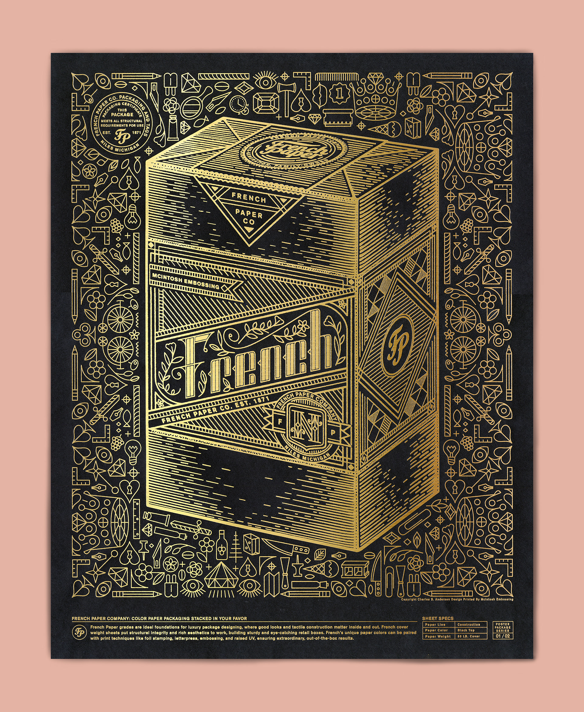 The Total Package poster series was done to draw awareness to a Specialty Construction Paper within the Packaging industry. Each poster was letterpress printed in gold foil.